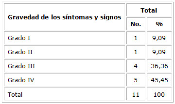 La gravedad de la reacción fue clasificada acorde al sistema clasificatorio asumido. Cinco pacientes (45,45 %) desarrollaron el grado máximo de severidad de la anafilaxia, definido por paro cardiaco y/o respiratorio. (Tabla 2)