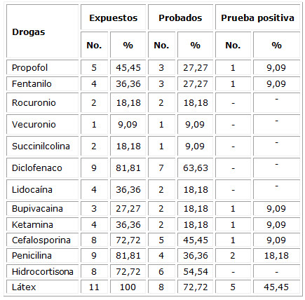 Los estudios alergológicos no incluyeron los gases anestésicos. Se realizaron estudios a todas las drogas y medicación utilizadas durante la investigación, excepto las reutilizadas con posterioridad a la reacción. La gravedad de la reacción fue clasificada acorde al sistema de clasificación asumido por Andrino-Silva et al.11 Los datos o variables a medir fueron extraídos de las historias clínicas hospitalarias.