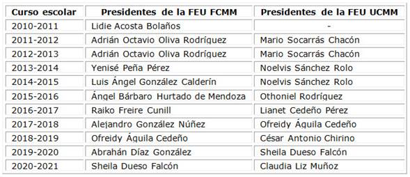 Mediante la resolución número 218 del 15 de mayo de 2009, fue otorgada la condición de Universidad de Ciencias Médicas de Matanzas, como institución educacional adscripta al Ministerio de Salud Pública.5 Con la nueva estructura, a la UCMM se le subordinaba la FCMM. Cada una contó con su Secretariado de la FEU y sus respectivos presidentes, a partir del curso escolar 2011-2012. (Tabla)