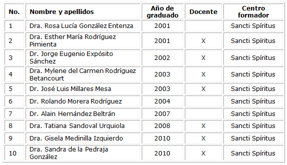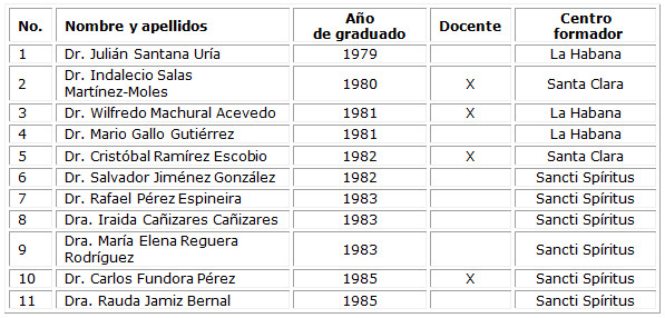 En 1979 se gradúa como especialista en Prótesis Estomatológica el Dr. Julián Santana Uría, en la Facultad de Estomatología de La Habana. Al año siguiente se gradúa el Dr. Indalecio Salas Martínez-Moles, en la Facultad de Estomatología de Villa Clara. En 1981 concluyen su especialidad los doctores Wilfredo Machural Acevedo y Mario Gallo Gutiérrez, en La Habana, y en 1982 el Dr. Cristóbal Ramírez Escobio, en Santa Clara. Todos ellos son considerados paradigmas de los servicios de prótesis en la ciudad de Sancti Spíritus.