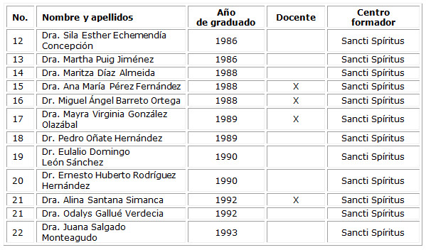 En el año 1996 se gradúa de especialista de primer grado la Dra. Pilar Velázquez Chinea, la cual obtuvo la carrera por vía directa, siendo su centro formador la Facultad de Estomatología de la provincia de Villa Clara, y en 1997 se gradúa el Dr. Alfredo Valdés Escamilla.