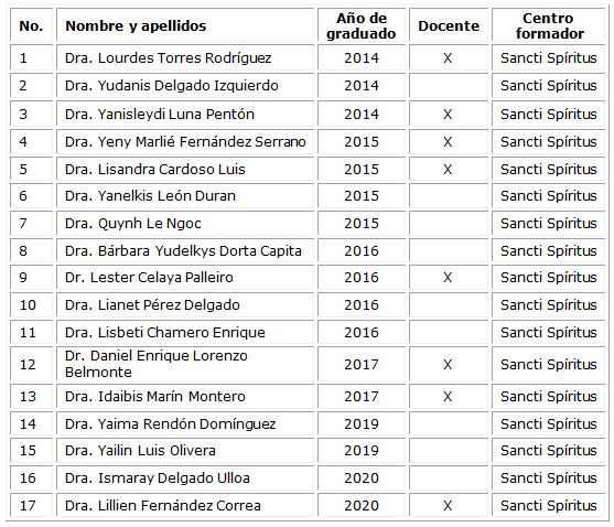En esta etapa se encuentran en formación seis residentes: dos en primer año (Dr. Raúl Antonio Fiallo Pérez y Dra. Deysi Rachel Orta Morell), tres en segundo (Dra. Ana Lilian Miranda Fando, Dra. Yarelis Fernández Petizco y Dra. Yésica González Pérez) y una en tercero (Dra. Yanelis López Fonstesilla). (Fig. 3)