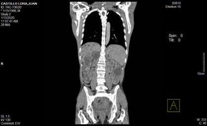 Abdomen: presencia de hepatomegalia que aproximadamente rebasa en 5 cm el reborde costal a expensas del lóbulo izquierdo; ligeramente doloroso, irregular, bordes mal definidos. Además, ambos riñones palpables e irregulares, dolorosos a la palpación.