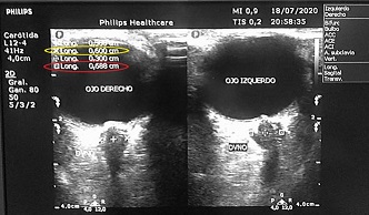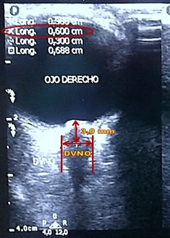 Se identificó el disco óptico como una banda hiperecogénica, y el DVNO proyectado posterior con relación a disco óptico, como una estructura hipoecogénica rodeada de una delgada banda hiperecogénica conformada por su cobertura meníngea. Se realizaron tres mediciones para cada ojo, mostrando un valor de 6,3, 6,6 y 6,00 mm en el derecho, y 6,8, 6,6 y 6,8 mm en el izquierdo (la última medición representada en la figura 2); promedio biocular: 6,5 mm.