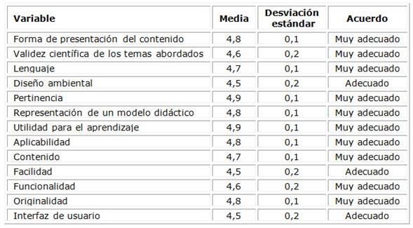 La representación del modelo didáctico recibió valoraciones de muy adecuado. Los especialistas emitieron criterios favorables a los indicadores de facilidad y funcionalidad. En pertinencia y utilidad para el aprendizaje, el 91,6 % de los encuestados lo consideró muy adecuado. El 83,3 % consideró muy adecuado el contenido, y el 16,7 % lo consideró adecuado. En cuanto a la interfaz de usuario, el 75 % la consideró muy adecuado, el 16,7 % adecuado y el 8,3 % indiferente.