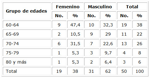 La tabla 1 demuestra que prevaleció el sexo masculino, con 31 pacientes, para un 62 % de la muestra. Asimismo, el rango de edad entre 60-64 años, con 19 pacientes, representó un 38 % de la muestra. Le siguió el rango comprendido entre 70-74 años, con 13 pacientes, para un 26 %.