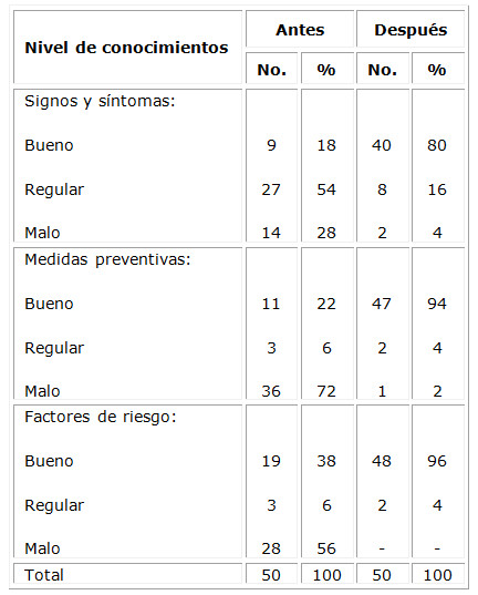 La tabla 2 revela que hubo un aumento considerable de los conocimientos sobre cada uno de los indicadores evaluados en dicha variable. En el caso de los signos y síntomas, aumentó el nivel de conocimientos antes/después, de un 18 a un 80 % en la escala de bueno, disminuyendo a un 16 % en la escala de regular luego de la intervención, lo que es aceptable en correspondencia con el grupo de edad que trabaja la intervención educativa.
