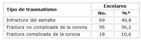 El 56,2 % de los pacientes estudiados presentaron fractura no complicada de corona, lo que se aprecia en la tabla 2. Favorablemente, la fractura complicada de la corona solo afectó a 18 escolares, para un 10,6 %.