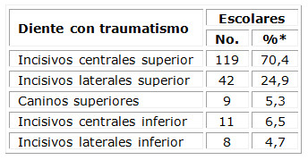 El 70,4 % de los dientes afectados correspondió a los incisivos centrales superiores; los caninos inferiores no estuvieron dañados. (Tabla 3)