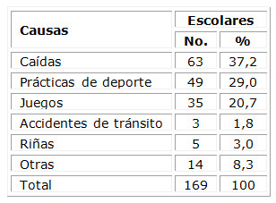 Las caídas y la práctica de actividades deportivas, con 37,2 % y 29,0 % respectivamente, fueron las más causas más representativas. (Tabla 4)