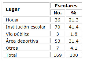 A criterio de los autores, a estas edades los niños desarrollan sus actividades diarias fundamentalmente en las instituciones escolares, seguidas de las áreas deportivas y el hogar, lo que constituye una alerta para crear ambientes más saludables y requiere de mayor preparación de las personas que están en contacto con los mismos, para que sean capaces de, además de realizar acciones de promoción y prevención, actuar de inmediato ante la ocurrencia de los mismos.