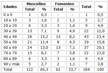 Se observa que más del 60 % de los pacientes son del sexo masculino, siendo más frecuente la aparición del CV en las edades comprendidas en los grupos de 40 a 69 años. (Tabla 1)
