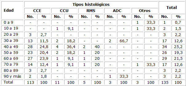 El tipo histológico más frecuente en las biopsias realizadas fue el carcinoma de células escamosas, con un total de 113 pacientes, representando el 61,4 %, seguido del carcinoma de células uroteliales y el rabdomiosarcoma respectivamente; pero el número de estos es significativamente menor. (Tabla 2)