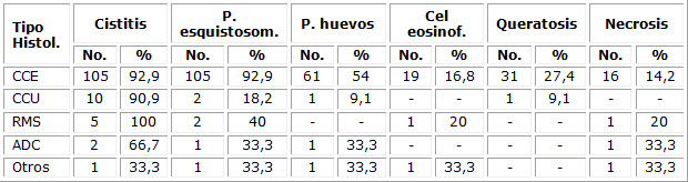 La cistitis, producto de la misma invasión parasitaria de los huevos y las lesiones que estos provocan en el urotelio, está presente en más del 90 % de los CCE, siendo el hallazgo anatomopatológico más frecuente. (Tabla 3)