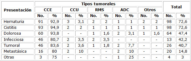 La presencia de infecciones urinarias asociadas estuvo presente en el 42,2 % de las historias revisadas, predominando la E. coli y el Citrobacter. La presentación de tumor palpable (40,7 %) fue la predominante. (Tabla 4)
