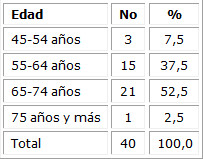 El 52,5 % de pacientes se encontraron entre la edad de 65 y 74 años, seguidos por un 37,5 % entre 55 y 64 años, un 7,5 % entre 45 y 54 años, y un solo paciente de 75 años y más, para un 2,5 %. (Tabla 1)