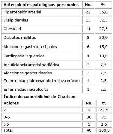 Un total de 22 pacientes padecían hipertensión arterial, los que representaron el 55,0 %. Otros prevalentes fueron las dislipidemias, con 13 casos para un 32,5 %, y la obesidad en el 27,5 %. En cuanto a otros antecedentes, la diabetes mellitus ocupó un lugar importante, ya que la padecían 8 pacientes (20,0 %), y las afecciones gastrointestinales y la cardiopatía isquémica estuvieron presentes en el 15 % y 10 % respectivamente. El 75 % de los pacientes presentaron un índice de comorbilidad de Charlson de 3 a 5 puntos; el 22,5 % obtuvo una puntuación de 2 puntos, y un porciento menor (2,5 %) los pacientes con Charlson > 5 puntos. (Tabla 3)