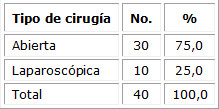 En la mayor parte de los pacientes fue realizado el procedimiento abierto (75,0 %), mientras que el abordaje por vía laparoscópica se hizo en 10 casos, para un 25,0 %. (Tabla 4)
