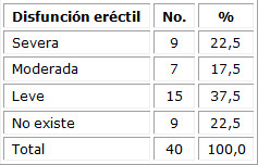 El 77,5 % de los pacientes intervenidos presentó algún grado de DE según el IIEF. El 37,5 % (n = 15) presentó DE leve, el 22,5 % (n = 9) DE severa, y el 17,5 % (n = 7) presentó DE moderada. Solo nueve casos, para un 22,5 %, no presentó afectación. (Tabla 5)