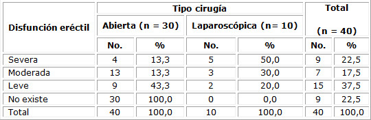 Resultados: el 52,5 % de los pacientes tienen un promedio de edad entre 65 y 74 años. Un índice de comorbilidad de Charlson de 3 a 5 puntos predominó en un 75 % de la muestra. En la vía laparoscópica, todos los casos presentaron disfunción eréctil, siendo severa en el 50 % de ellos. El 22,5 % del total no la tuvieron, representando un 30 % de los operados por cirugía abierta.
