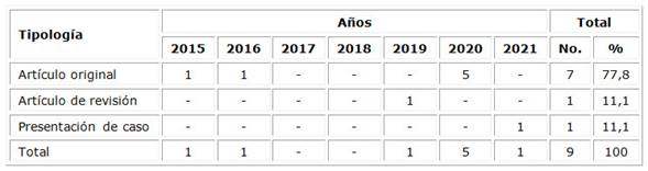 Materials and methods: a bibliometric, descriptive and retrospective study was carried out. The universe was constituted by 9 articles, of which typology, year of publication, quantity of authors, province and centers of origin, quantity of references; quantity of articles per journal and number of times cited were analyzed.