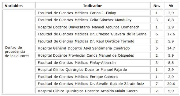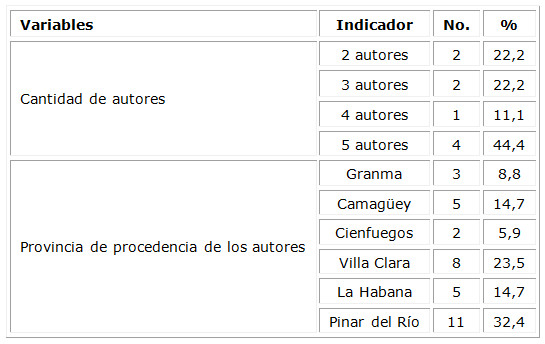 La investigación de Jiménez Franco et al.5 reportó un predominio de artículos con tres autores, al igual que un mayor número de autores provenientes de Villa Clara, resultados que difieren de los de este estudio. Por su parte, un análisis realizado por Díaz Rodríguez et al.,11 señaló a la Universidad de Ciencias Médicas de Cienfuegos como la institución que mayor número de autores aportó, mientras que Ramos Cordero et al.12 identificaron a la Universidad de Ciencias Médicas de Pinar del Río como el centro que mayor número de autores aportó, resultado que coincide con la presente.