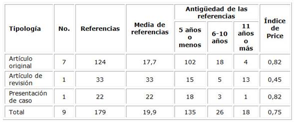 Estudios reportan un Índice de Price que oscila entre 0,625 y 0,90.14 El Índice de Price determina el grado de actualización de las referencias empleadas, de ahí que, si este es mayor, más actualizadas son las referencias de los artículos analizados. Es necesario que los artículos presenten, siempre que sea posible, referencias actualizadas, pues las ciencias médicas son un área del conocimiento en constante evolución y cambio. Mientras más recientes sean los artículos citados, puede considerarse que más actualizada está la evidencia contrastada.