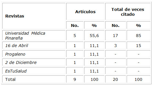 El 55,6 % de los artículos fueron publicados en la revista Universidad Médica Pinareña, medio que a su vez recibió el 85 % de citación. La revista 16 de Abril, por su parte, publicó solo un artículo y concentró el 15 % de las citas (tabla 5). La media de citas fue de 2,22 por artículo.
