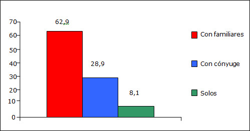 Se comprobó en el estudio que existe un gran predominio de adultos mayores que tienen convivencia con familiares, representado por 146 pacientes, para un 62,9 %. (Gráfico)