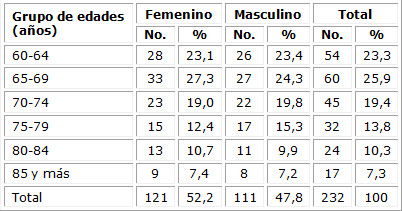 Al observar la tabla 1 y emplear el análisis estadístico, se obtuvo que hay un predominio de ancianos en el grupo de 65-69 años, con 60 pacientes, lo que representa un 25,9 %, seguido por el grupo de 60-64 años, con un total de 54 pacientes, para un 23,3 %.