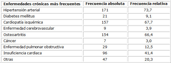 Con respecto al comportamiento de las enfermedades crónicas, la hipertensión arterial ocupó significativamente el primer lugar, para un 73,7 %, seguida de la cardiopatía isquémica, con un 67,7 %. (Tabla 2)