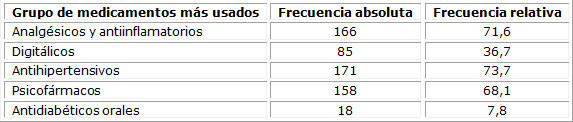Se observa en la tabla 3 que hay un uso más frecuente de medicamentos antihipertensivos, representando un 73,7 %. También hubo un uso elevado del grupo de analgésicos y antiinflamatorios (71,6 %), y de psicofármacos (68,1 %).