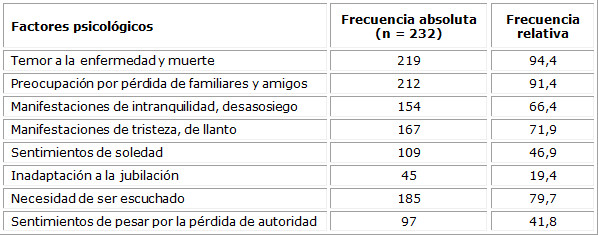 En la tabla 4 se muestra la distribución de la muestra según los aspectos psicosociales que mayoritariamente interfieren en los ancianos, identificados por su propia percepción. Los principales factores psicológicos fueron: temor a la enfermedad y preocupación por pérdida de familiares y amigos, representando un 94,4 y 91,4 %, respectivamente. Además, hubo problemas con la necesidad de ser escuchados (79,7 %), las manifestaciones de tristeza, de llanto y temor a la muerte (71,9 %)