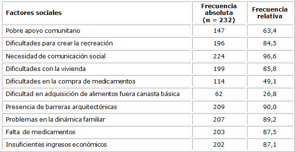 La presencia de barreras arquitectónicas (90 %), problemas en la dinámica familiar (89,2 %) y falta de medicamentos (87,5 %), seguidos de insuficientes ingresos económicos, dificultades para lograr la recreación, dificultades para adquirir los alimentos fuera de la canasta básica, dificultades en la vivienda y en la compra de los alimentos fueron aspectos a considerar.