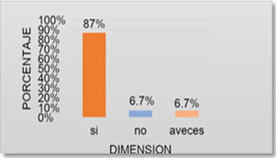 Se abarca, entre las principales dimensiones, la percepción del paciente sobre si fue atendida su urgencia presentada de inmediato o no. En dicha encuesta, se obtuvo el 87 % de afirmación, el 6,7 % de a veces y un 6,7 % no obtuvo una atención inmediata. (Gráfico 1)