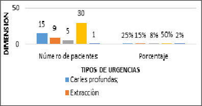 De acuerdo a la revisión de la literatura, se puede determinar que durante la atención odontológica se divisó la afluencia de pacientes que acudían con diferentes urgencias dentales. En ellos predominaron las urgencias por caries profunda, desencadenando en infección pulpar acompañada con inflamación dentaria.
