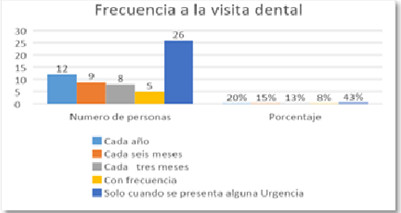En cuanto a las visitas periódicas en el área de odontología, se obtuvo que el 43 % solo asistía cuando se le presentaba una urgencia, el 20 % cada año, el 15 % cada seis meses, el 13 % cada tres meses y el 8 % con frecuencia. (Gráfico 6)