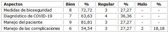Nivel de conocimiento (cualitativa nominal): se evaluó con tres niveles de bueno, regular y malo, destacándose los aspectos de cumplimiento de las normas de bioseguridad, diagnóstico del SARS-CoV-2, manejo del paciente y manejo de las complicaciones. Para cada aspecto evaluado se utilizaron cinco preguntas de opción múltiple, que evalúan las respuestas, donde 4-5 es buena, 3 es regular y 1-2 es mala.