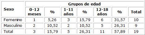 En cuanto a los 19 pacientes pediátricos atendidos en terapia intensiva, se constató que el 57,89 % fue de adolescentes (12-18 años), sin distinción de sexos. El menor porciento estuvo en la etapa lactante (0-12 meses), con 15,79 %. (Tabla 2)