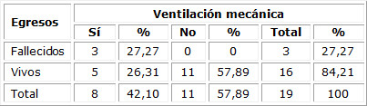 Por su parte, al estudiar la relación entre los pacientes egresados y los que se trataron con ventilación mecánica, se constata que el 42,10 % recibieron apoyo ventilatorio, y 3 de 19 (27,27 %) egresaron como fallecidos. (Tabla 3)