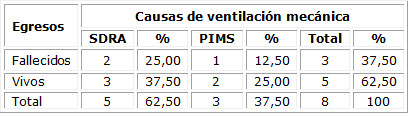 En cuanto a las causas que llevaron a la ventilación mecánica y el tipo de egreso, se observó que la principal fue el SDRA en el 62,50 % de los pacientes ventilados, y solo el 37,50 % padeció el PIMS. Cabe destacar que este último causó mayor mortalidad (25 %). (Tabla 4)