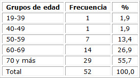 En la tabla 2 se puede observar que en la distribución según grupos de edades, existió un predominio de los mayores de 70 años en más de la mitad de los casos, aunque es de destacar un caso menor de 39 años.