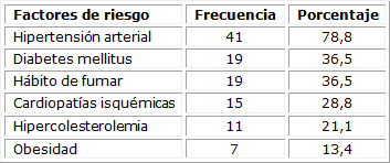El factor de riesgo más común encontrado en la presente investigación fue la hipertensión arterial, coincidiendo con varios estudios internacionales.15,16 Estos resultados también coinciden con Moldes Acanda et al.,17 quienes en un estudio realizado en Venezuela encontraron que el 78,13 % de los pacientes diagnosticados de IMA padecían de HTA, diabetes mellitus y eran fumadores. Otros estudios han encontrado un mayor índice de diabetes mellitus en las féminas,16 a diferencia de los resultados encontrados en este trabajo.