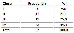 Empleando los datos obtenidos por el método clínico, para intentar predecir la evolución y mortalidad de estos pacientes, esta investigación encontró un predominio en las clases III y IV de Killip y Kimbal, donde se acumuló más del 69 % de los casos, lo cual muestra el grado de fallo miocárdico presentado por estos pacientes al ser recibidos en las unidades de terapia intensiva del Hospital Clínico Quirúrgico Docente Amalia Simoni. Frecuentemente, el convaleciente con IMA se presenta en estado de franca desesperación y el médico debe valorar los datos de la anamnesis y el examen físico para poder llegar a una valoración oportuna, por lo que la realización de acciones médicas inmediatas facilita la estabilización del enfermo. La clasificación Killip-Kimball permite establecer la pauta a seguir, y ayuda a ofrecer el valor pronóstico inmediato y a largo plazo.19