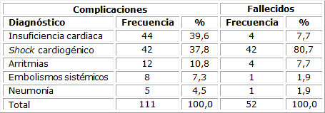 La tabla 5 muestra las principales complicaciones que se presentaron en estos casos, donde se puede observar un amplio predominio del fallo de bomba en forma de insuficiencia cardiaca, seguido por el shock cardiogénico, destacando que todos los pacientes portadores de shock cardiogénico fallecieron, y que de los portadores de insuficiencia cardiaca solo falleció un escaso número, al igual que de otras complicaciones.