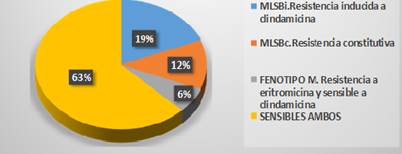 El fenotipo MLSBi de resistencia inducida a clindamicina se encontró en el 19 %, siendo mayor que lo registrado en Colombia en 2019 para ese fenotipo (7,5 %)1 y mayor que el único estudio cubano, que lo reporta en un 11,1 %.13