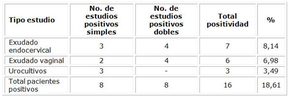 De las 86 gestantes con cultivos positivos que fueron estudiadas, el S. agalactiae se aisló del 8,14 % de los exudados endocervicales, del 6,98 % de los exudados vaginales, y del 3,49 % de los urocultivos. Se encontraron 4 pacientes donde se obtuvo positividad duplicada para exudado vaginal y exudado endocervical. Se encontró una prevalencia global de S. agalactiae de 18,61 % en la muestra estudiada. (Tabla 1)