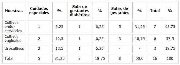 De los cultivos vaginales, el mayor porcentaje se encontraba en sala abierta de gestante, para un 18, 75 %. De las pacientes con urocultivos positivos, la mayor parte se encontraba en servicio de cuidados especiales (12,5 %), siendo esto algo preocupante, ya que la positividad de urocultivos puede traducir una elevada colonización genital que no se pudo comprobar en estas pacientes, pero no se descarta colonización rectal, que no se pudo demostrar en el estudio.