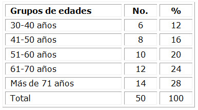 En la tabla 1 se puede observar el predominio de pacientes a partir de los 50 años de edad, donde aparecen más de dos tercios de la muestra.