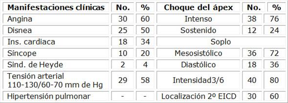 Tras analizar las manifestaciones clínicas, en la tabla 4 se puede observar un claro predominio de la angina de pecho y la disnea de esfuerzo. Pocos casos aquejaron síncope, y otros, aislados, presentaron ectasias vasculares en el examen físico, donde también se observó el choque de la punta, el cual es muy intenso en el 2º espacio intercostal derecho, con un soplo mesosistólico sostenido en el mayor número de pacientes grado 3/6, junto a un segundo ruido débil, acompañado en un pequeño porciento con un componente diastólico. Respecto a las cifras tensionales, predominan la tensión arterial normal o baja, tanto sistólica como diastólica, no apareciendo hipertensión pulmonar en ningún caso.